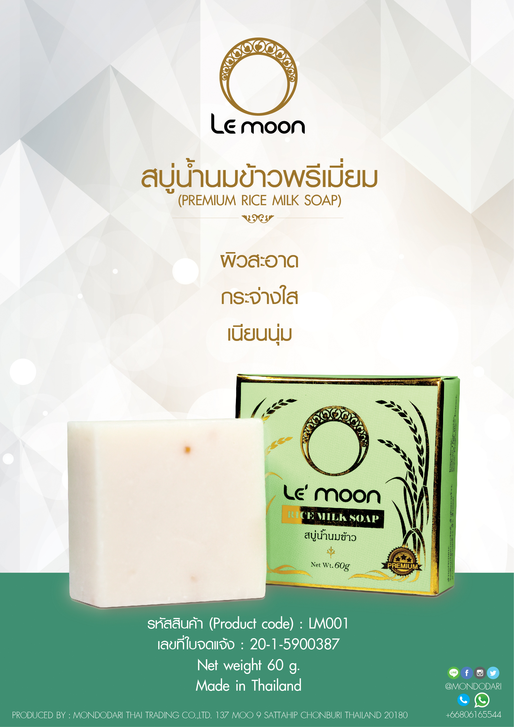 เลอมูน สบู่น้ำนมข้าวแท้ 100% มีกลิ่นหอมอ่อนๆ ตามธรรมชาติของน้ำนมข้าวแท้ๆ ช่วยเพิ่มความสะอาดสดชื่นให้แก่ผิวหน้า มีคุณสมบัติในการทำความสะอาดผิวหน้าได้อย่างมีประสิทธิภาพ โดยไม่ระคายเคือง ใช้ได้กับทุกสภาพผิว คนที่มีผิวแพ้ง่ายหรือผิวแห้งมากก็สามารถใช้ได้ไม่มีผลข้างเคียง